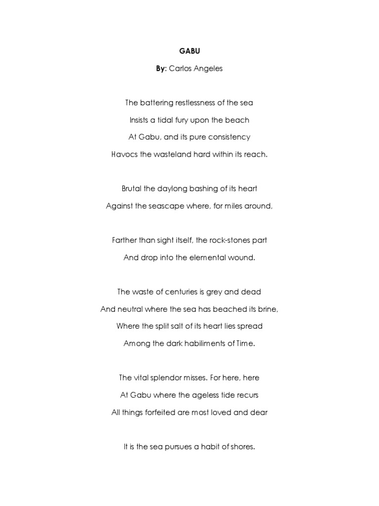 And we are too abusive and need to suppress it so the poems gabu was written. Judimie ayuban uncategorized leave a comment january 9, 2018 1 minute. Gabu is a place in ilocos norte. 1 ilu of philippine civilization. This is a compilation of gabu by carlos angeles. Produced by:ilogos music and cedo mixed and mastered by: Analysis angeles carlos poem essays gabu. Get help on 【 gabu by carlos angeles sample 】 on graduateway ✅ get your custom essay on. Essay about type of music. Often, when typhoon occurs, large tidal waves go rampant, even affecting pagudpod itself. Because this poem says that we should preserve and appreciate nature. Selection the battering restlessness of the sea insists a tidal fury upon the beach at gabu and its pure consistency havocs. He made it to make people understand our life's a beach.